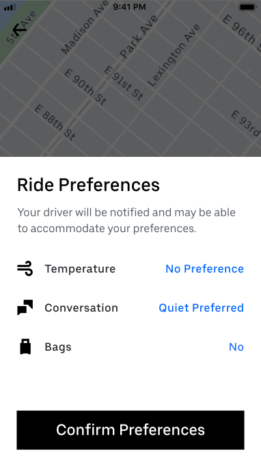 Quiet Mode comes as part of a new slate of Rider Preferences features that users can set up before they hail an Uber Black or SUV, but not while waiting for their ride or while in the car. A Bags option lets users signal that they have luggage with them so the driver knows to pull over somewhere they can help load them into the trunk. The Temperature control lets them request the car be warm or cold so drivers know whether to crank the air conditioning.