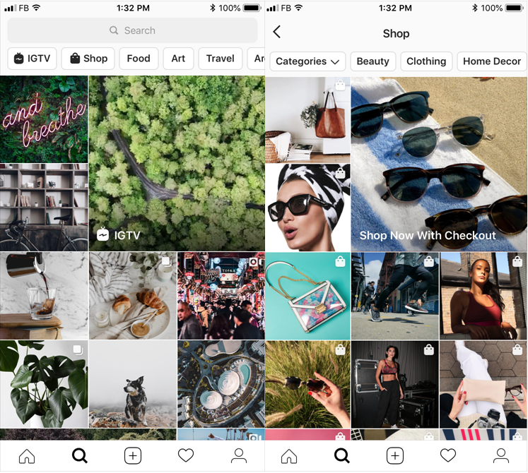 Additionally, Instagram Explore is getting a redesigned navigation bar up to with shortcuts to Shopping and IGTV first, followed by channels for topics like Travel, Food, and Design. In a nod to how central Instagram sees Shopping and IGTV to its future, those categories will also get big square portals inset within the Explore grid. Tapping these squares or shortcuts for Shopping reveals category filters for specific proucts like Clothing, Beauty, and Home Decor. For IGTV, they pull up an new vertical scrolling IGTV discovery grid to contrast with its old horizontal scrolling carousel.