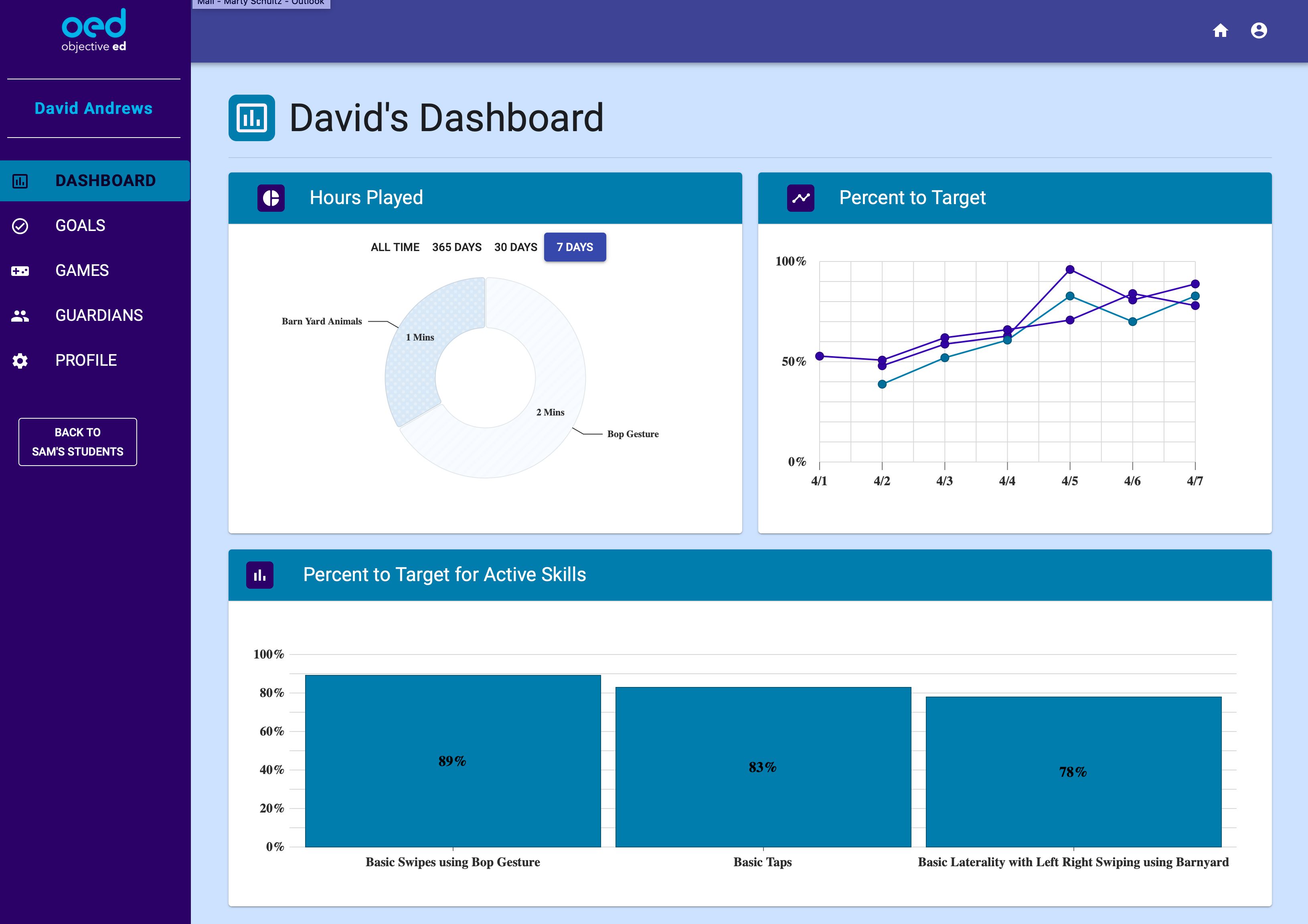 “If the IEP objective is ‘Child will understand left versus right and succeed at performing this task 90% of the time,’ the teacher will first introduce these concepts and work with the child during their weekly session,” Schultz said. That’s the kind of hands-on instruction they already get. “The child plays Barnyard in school and at home, swiping left and right, winning points and getting encouragement, all week long. The dashboard shows how much time each child is playing, how often, and their level of success.”