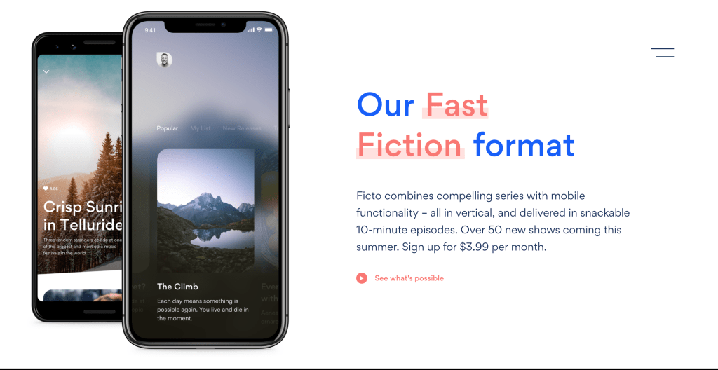 Both services are entering a highly competitive and increasingly fragmented entertainment landscape with many big studios building moats around their content in the form of exclusive subscription-based streaming services. Both Quibi and Ficto see short form as a way to break through with a new kind of storytelling built for mobile media first.