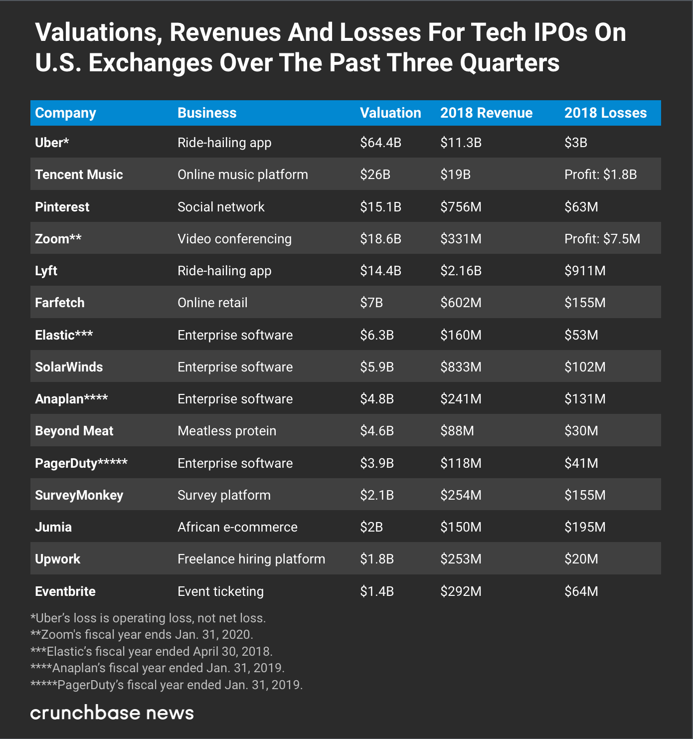 So how do Uber’s revenues, losses and valuation stack up amidst the recent crop of unicorn IPOs? To put things in context, we assembled a list of 15 tech unicorns that went public over the past three quarters. We compared their valuations, along with revenues and losses for 2018 (in most cases the most recently available data), in the chart below: