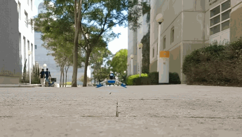 Of course you could have a drone that simply has a couple of wheels on the bottom that let it roll along. But this improves on that idea in several ways. In the first place, it’s mechanically more efficient because the same motor drives the rotors and wheels at the same time — though when rolling, the RPMs are of course considerably lower. But the rotating arms also give the robot a flexible stance, large wheelbase and high clearance that make it much more capable on rough terrain.