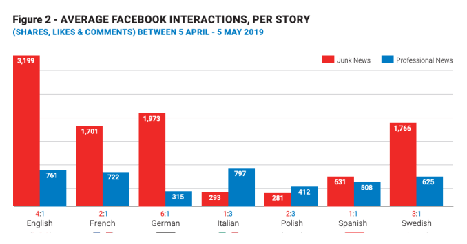 “While junk news sites were less prolific publishers than professional news producers, their stories tend to be much more engaging,” they write in a data memo covering the study. “Indeed, in five out of the seven languages (English, French, German, Spanish, and Swedish), individual stories from popular junk news outlets received on average between 1.2 to 4 times as many likes, comments, and shares than stories from professional media sources.