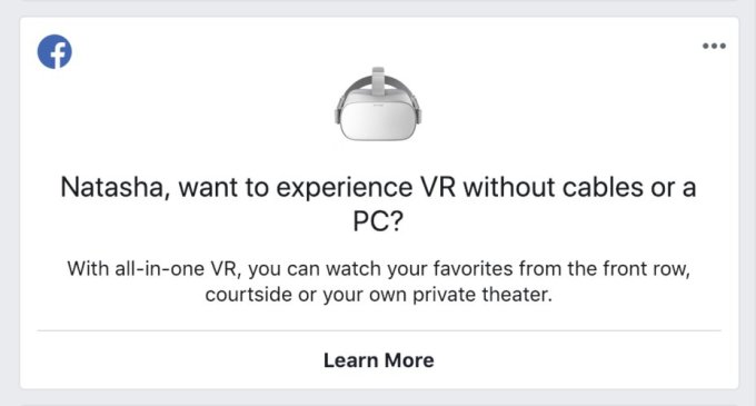 Meanwhile, Facebook has, for months, been running native ads for Oculus via its eponymous and omnipresent social network — although there’s no explicit mention of the Oculus brand unless you click through to “learn more.”