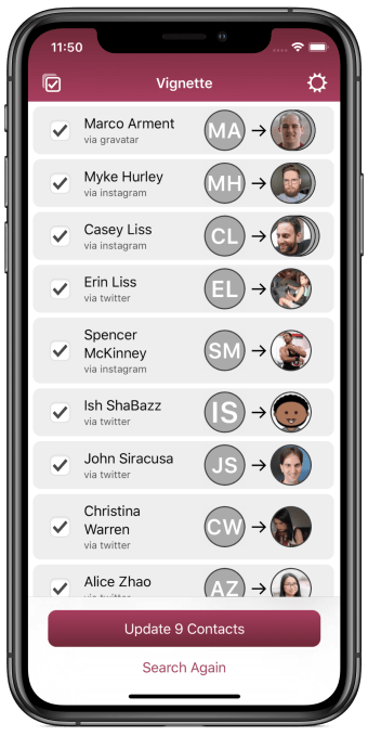 Vignette is simple to use. The app will scan select fields in your Contacts, including Email (which is used for Gravatar), Twitter, Facebook and the Custom social network field, Instagram. (Instagram is not one of the built-in options in iOS Contacts, unfortunately).