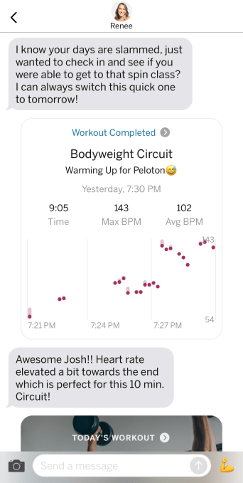 For example, I wanted to burn a few pounds without burning too much time by adding a gym day or two plus some warmup strength training before my home Peloton rides. My trainer Renee Zernicke, a former University of Wisconsin director of Sports Performance for basketball, designed a 30-minute weight-lifting circuit and some 10-minute bodyweight exercise plans for me. When I messaged her that I was doing a more intense spin class today, she remixed my warmup exercises to avoid legs so I wouldn’t be tired during my ride. So far she’s always responded within a few minutes, and been cheerful yet forceful. “I know your days are slammed, just wanted to check in and see if you were able to get to that spin class?” she messaged me at 6:30pm. That’s something even most in-person trainers don’t do.