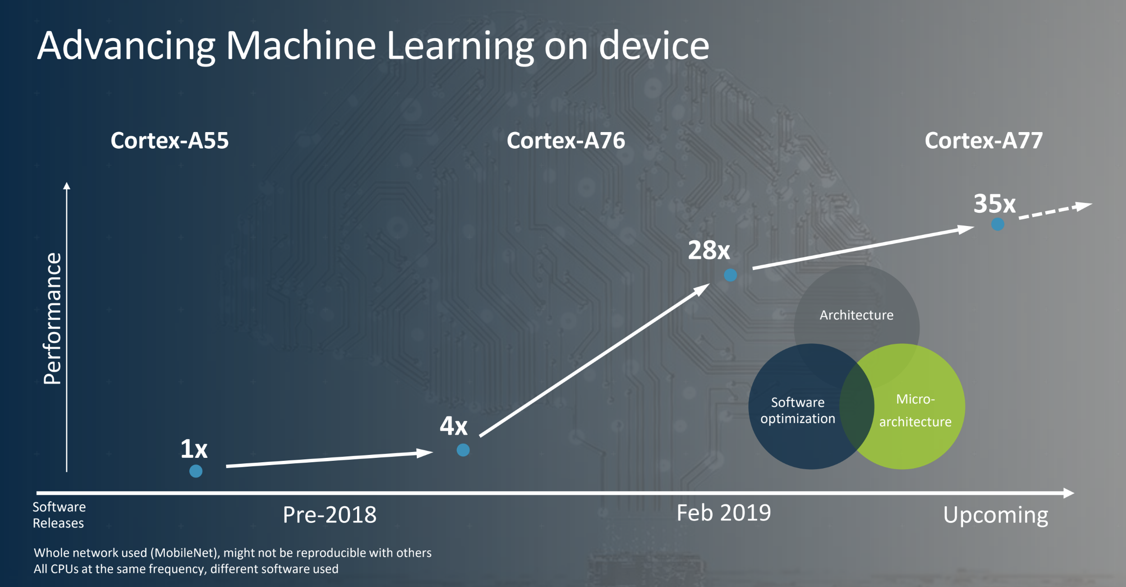 Another area Arm is betting on is mobile gaming — and by extension, mobile VR and AR experiences. The new Mail-G77 GPU architecture is the first one based on the company’s Valhall GPU design and promises a 1.4x performance improvement over the G76. It’s also 30 percent more energy efficient and — and I’m guessing you can spot a theme here — 60% faster at running machine learning inference and neural net workloads.