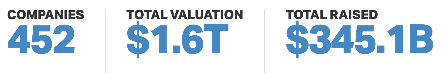 The Unicorn Leaderboard now lists 452 companies, which have collectively raised $345 billion and represent a cumulative valuation of $1.6 trillion. Go back to February 2018 and there were just 279 companies, with $206 billion raised and valued at $1 trillion. In just 15 months 170+ companies reached unicorn status, raised $140 billion more and added $600 billion in company valuations.