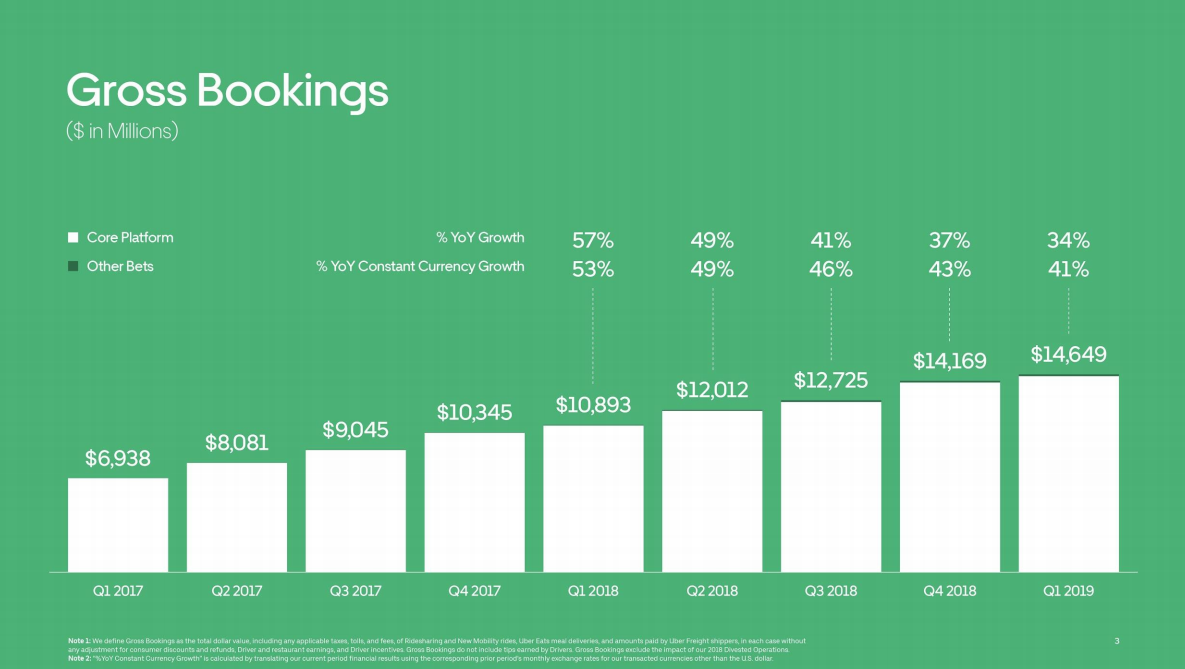 Gross bookings are the revenue earned minus things like taxes, tolls, fees, wages paid to drivers, restaurants and so forth.