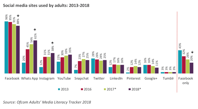 As in previous years of Ofcom ‘state of the Internet’ reports, the Online Nation study also found that Facebook use still dominates the social media landscape in the UK.