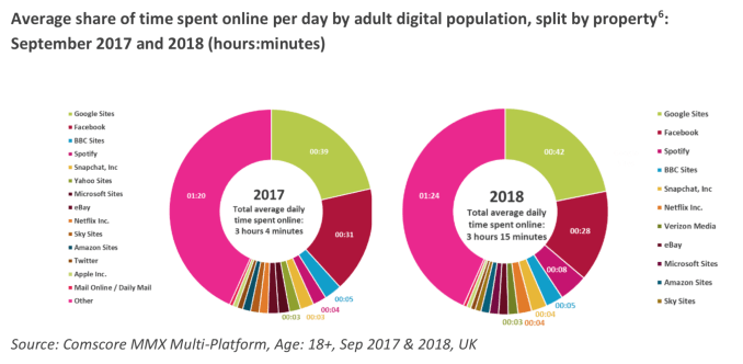 The report also recorded an increase in people using multiple social services — with just a fifth of social media users only using Facebook in 2018 (down from 32% in 2018). Though as noted above, Facebook still dominates time spent, clocking up way more time (~23 minutes) per user per day on average vs Snapchat (around nine minutes) and Instagram (five minutes).