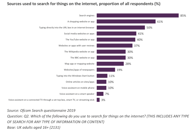 The report findings also indicate that use of voice-based search interfaces remains relatively low in the UK, with just 10% using voice assistants on a mobile phone — and even smaller percentages tapping into smart speakers (7%) or voice AIs on connected TVs (3%).