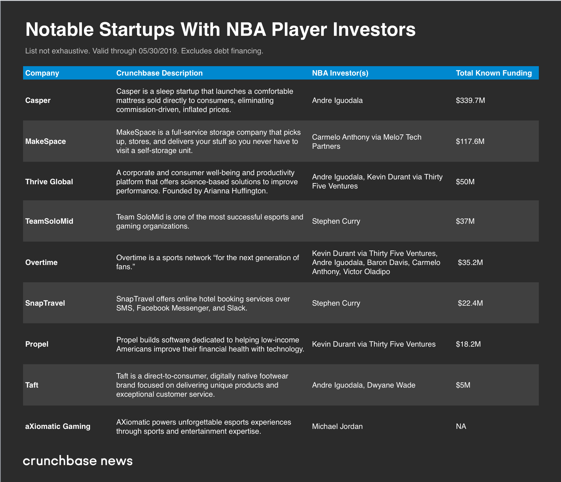 In honor of the big games, we took a shot at breaking down investment activities of the players off the court. Last fall, we did a story highlighting some of the sport’s more prolific investors. In this piece, we’ll take a deeper dive into just what having an NBA player as a backer can do for a startup beyond the capital involved. But first, here’s a chart of some startups funded by NBA players, both former and current.