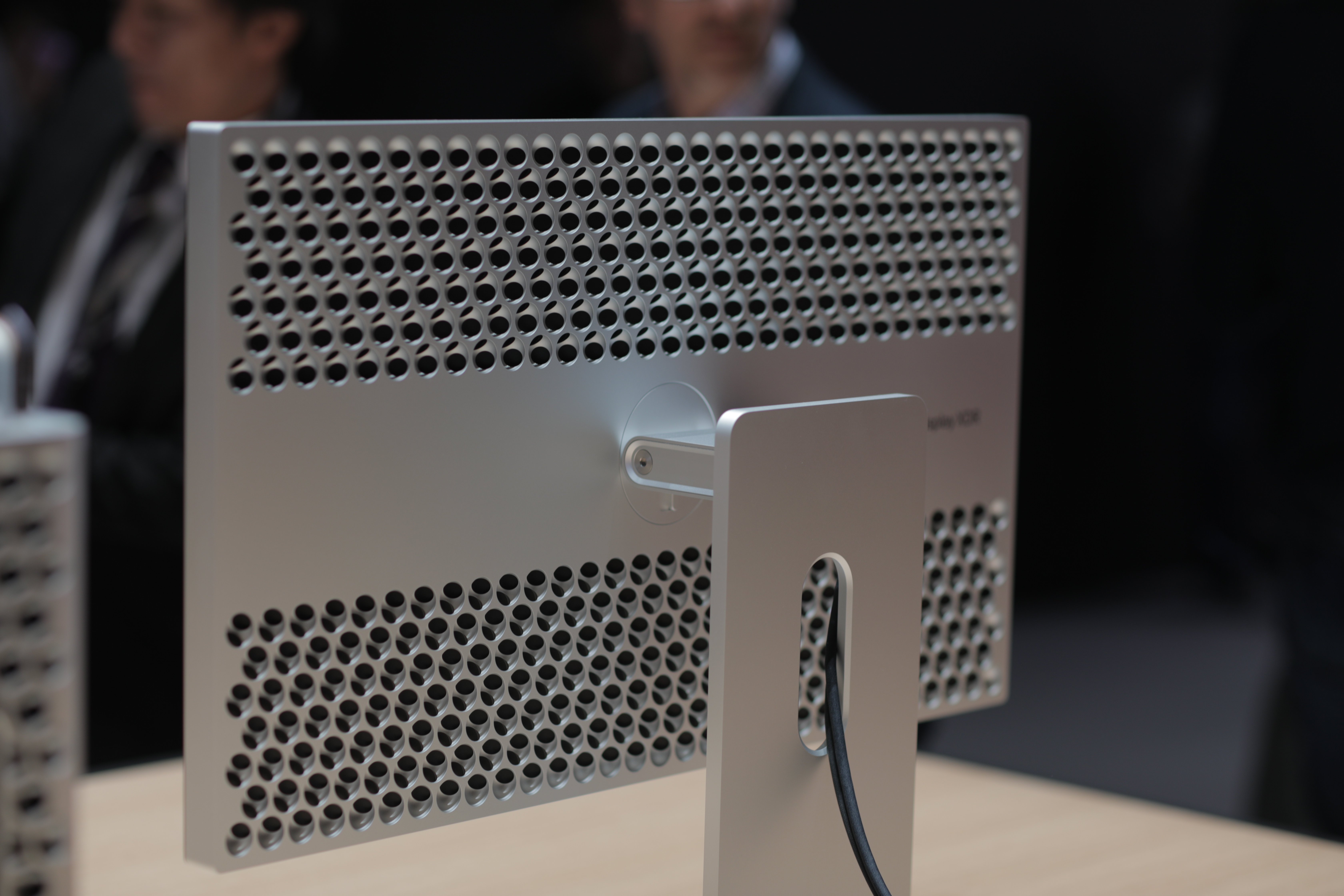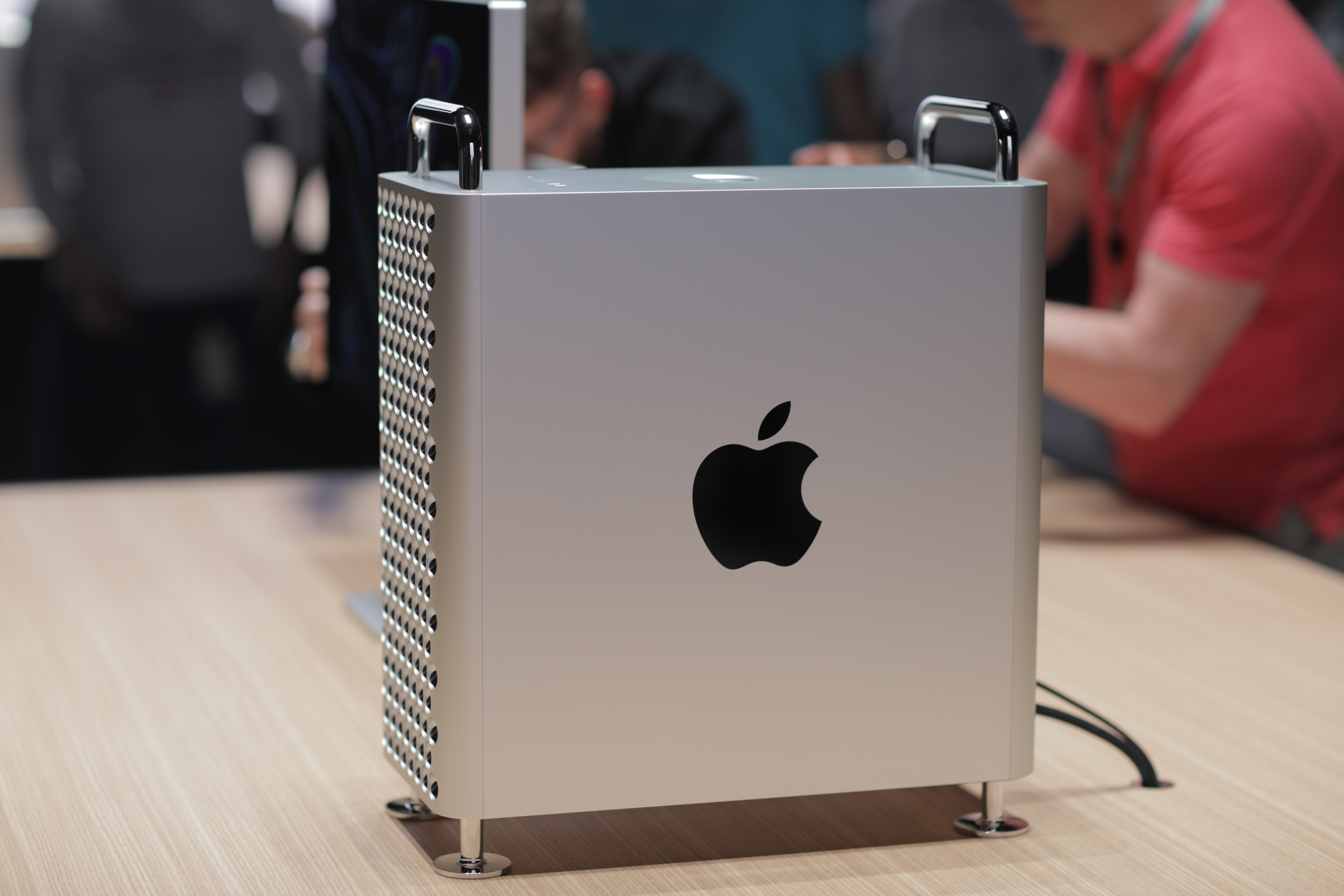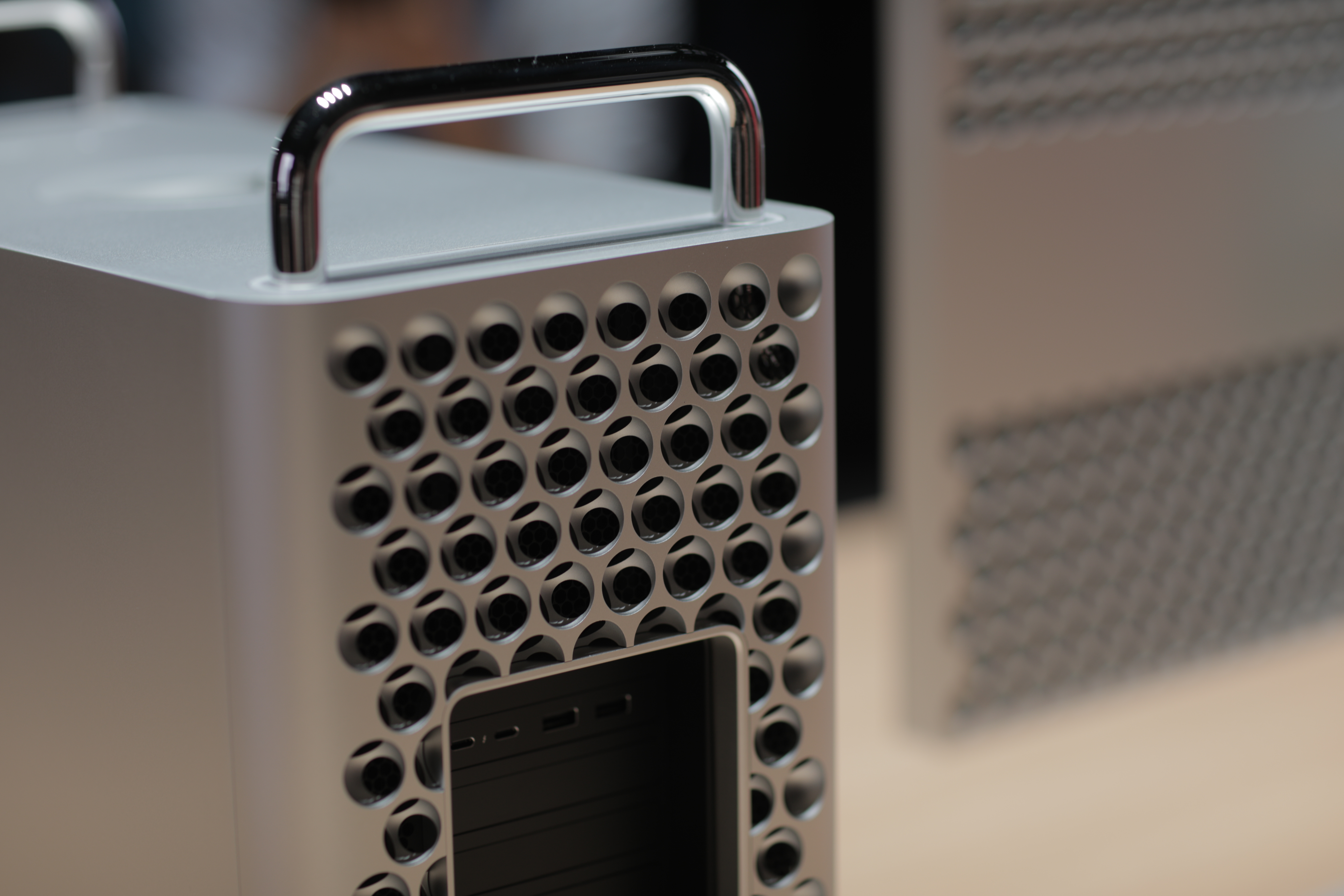 The Pro’s certainly striking. Looks-wise, it’s a more direct descendent of the shiny metal Power Mac G5 tower of yore than the more recent trashcan Pro. There are plenty of tweaks, of course. It appears a bit smaller than the G5, while the vent holes have been made much larger, for a kind of cheese grater design, at first glance — an effect that’s only enhanced by the prominent handle up top.