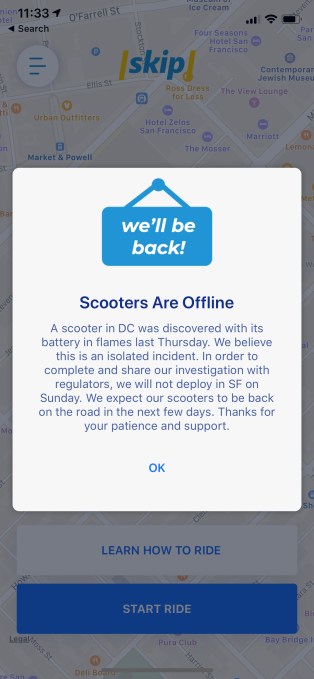 In Skip’s app, it notifies riders that its scooters are currently offline and have been since yesterday. Skip says it expects the scooters to return “in the next few days.”