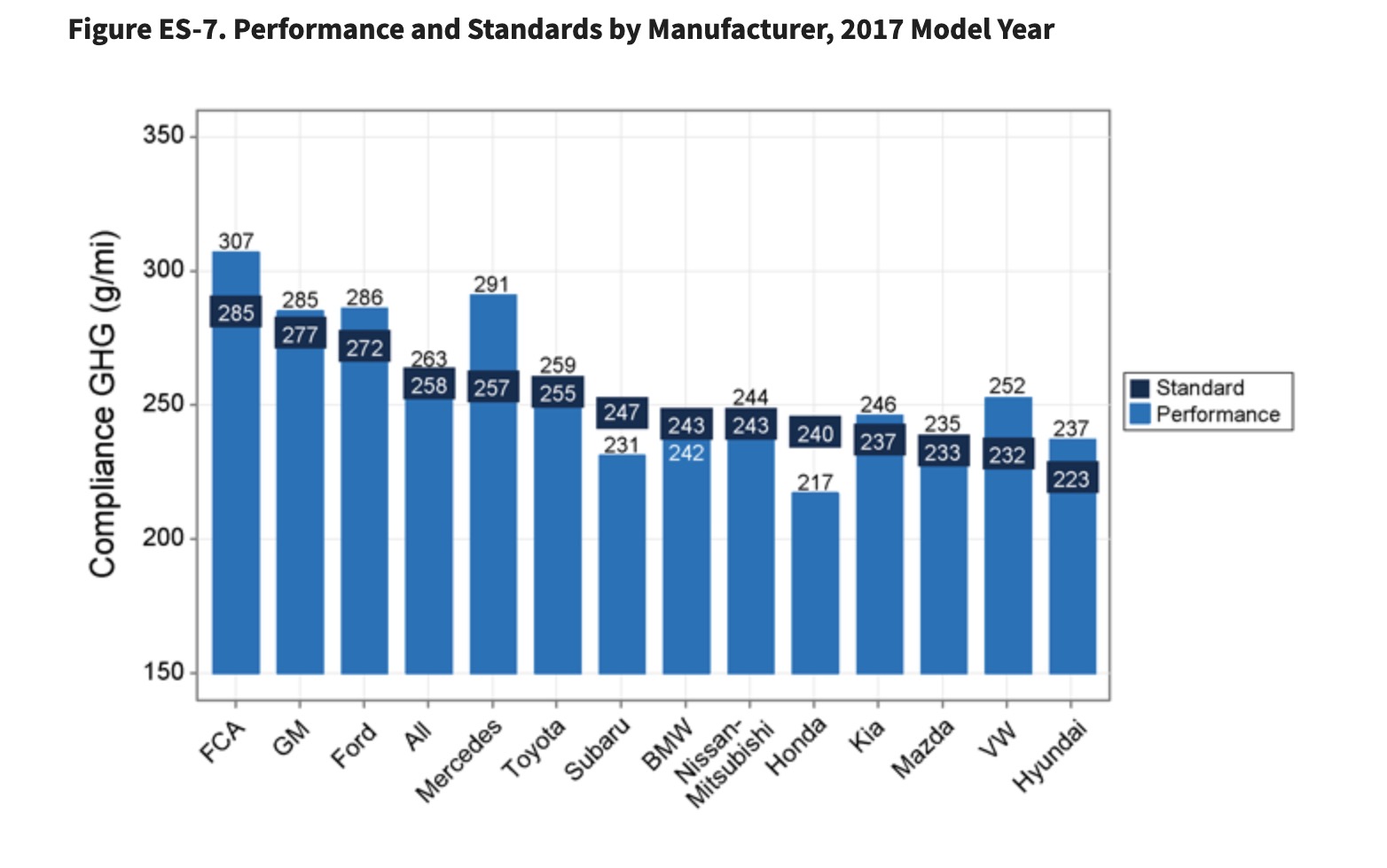 But as Bloomberg and even Tesla’s own CFO Zachary Kirkhorn has noted, these ZEV credits stand to become a bigger part of Tesla’s business. A recent EPA report found that most large automakers used banked credits, along with technology improvements, to maintain compliance in model year 2017. Three large manufacturers achieved compliance based on the emission performance of their vehicles, without using additional banked credits, according to the EPA. The graph below, from the EPA’s report, shows how automakers have complied.