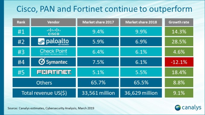According to Canalys, the biggest players in the space are Cisco with 9.9% of the market, up 14.3% from 2017. (Cisco bought Duo Security last year for $2.35 billion, another proof point of the value of security companies.) Palo Alto is number two in the market with 6.9%, and grew a brisk 28.5% from the previous year. Meanwhile, CheckPoint checks in at number three with 6.1%.