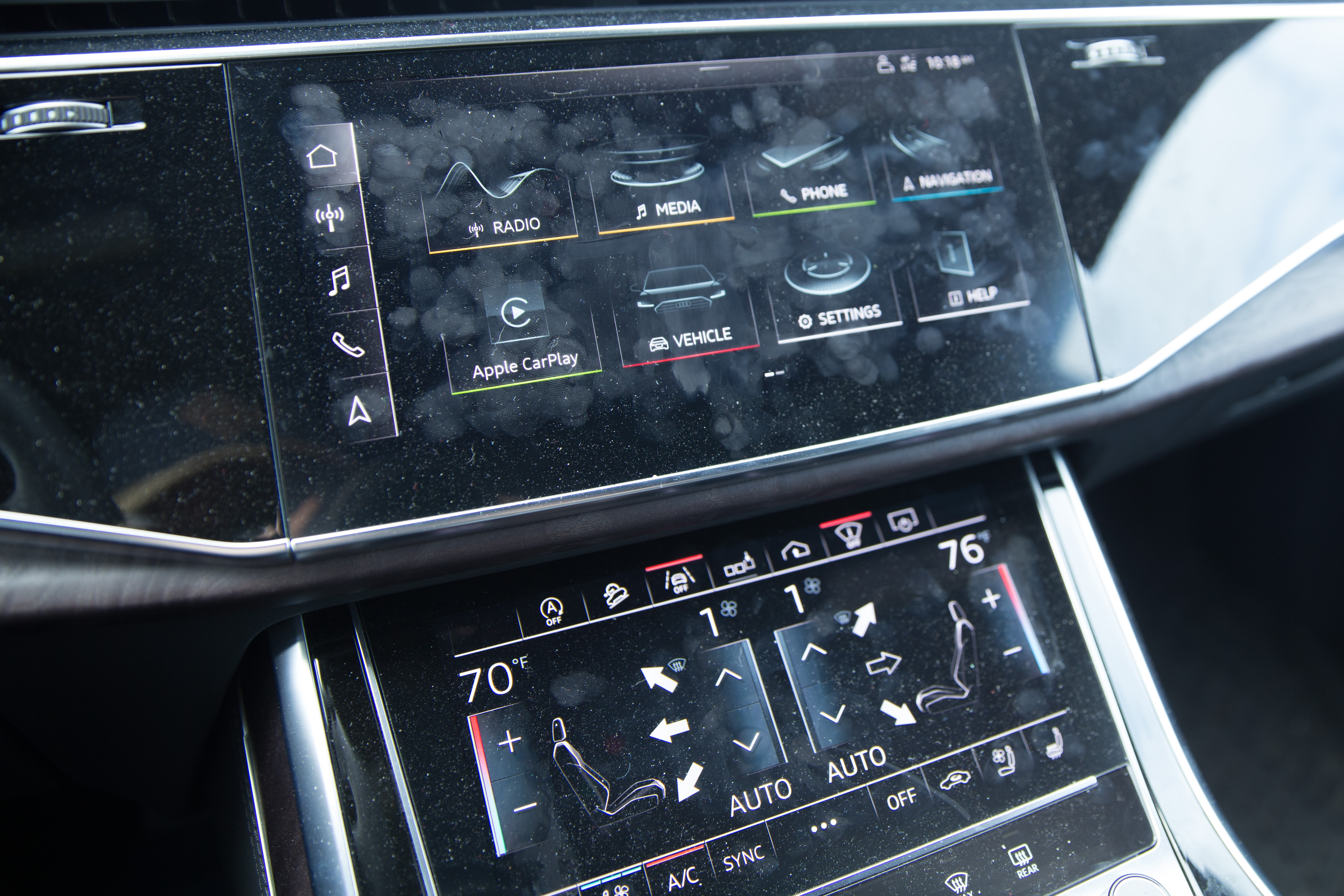 There are two screens placed in the center stack of the Q8. The top one features controls for the radio, mapping system and vehicle settings. The bottom screen is for climate controls and additional controls like garage door opener and the vehicle’s cameras. Both have haptic feedback, so the buttons feel nearly real.