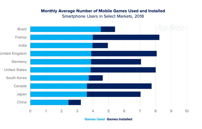 In the U.S., users generally have eight games installed per device; globally, we play an average of two to five games per month.