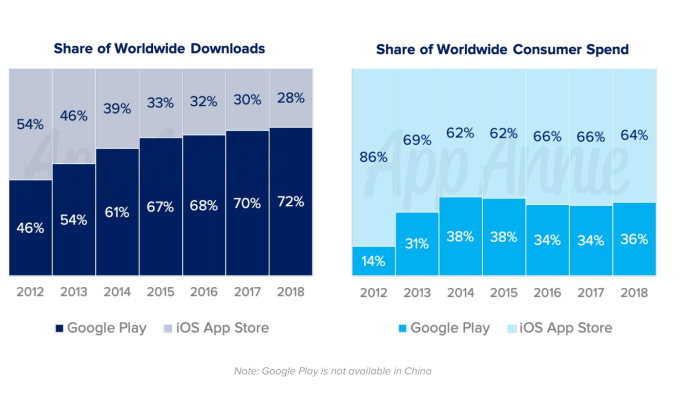 Google Play is known for having more downloads than iOS, but continues to trail on consumer spend. In 2018, Google Play grabbed a 72% share of worldwide downloads, compared with 28% on iOS. Meanwhile, Google Play only saw 36% of consumer spend versus 64% on iOS.