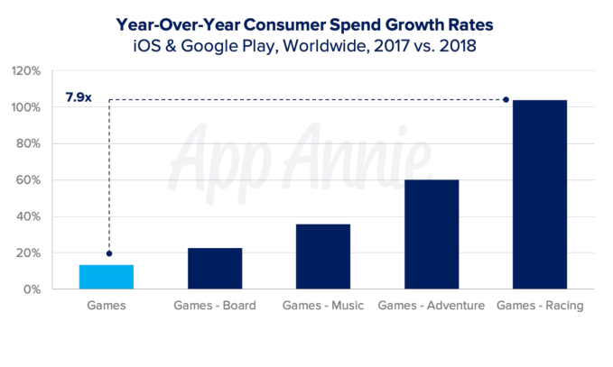 Consumer spend in this subcategory of gaming grew 7.9 times as fast as the overall mobile gaming market. Adventure games did well, too, growing roughly five times the rate of games in general. Music games and board games were also popular.