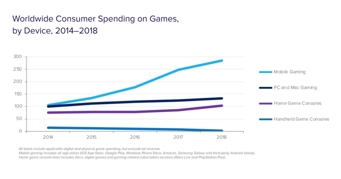 According to App Annie, mobile gaming is larger than all other channels, including home game consoles, handheld consoles and computers (Mac and PC). It’s also 20% larger than all these other categories combined — a shift from only a few years ago, attributed to the growth in the mobile consumer base, which allows mobile gaming to reach more people.