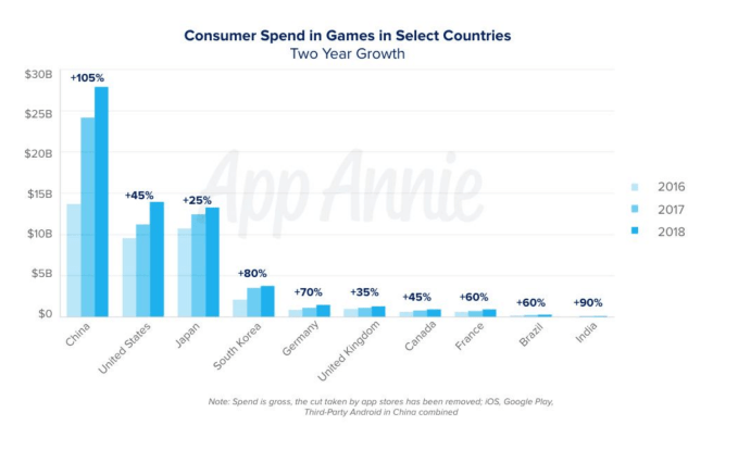 With the continued steady growth in consumer spend and the stable time spent in games, App Annie states the monetization potential for games is growing. In 2018, there were 1,900 games that made more than $5 million, up from 1,200 in 2016. In addition, consumer spend in many key markets is still growing too — like the 105% growth in two years in China, for example, and the 45% growth in the U.S.