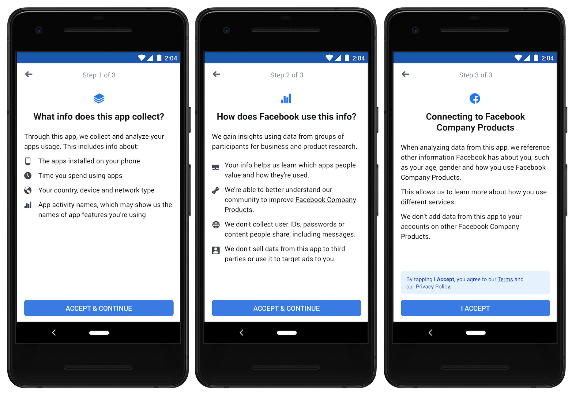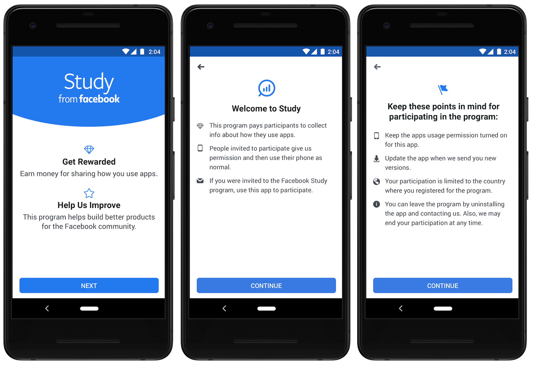 Today Facebook releases its “Study from Facebook” app for Android only. Some adults 18+ in the U.S. and India will be recruited by ads on and off Facebook to willingly sign up to let Facebook collect extra data from them in exchange for a monthly payment. They’ll be warned that Facebook will gather which apps are on their phone, how much time they spend using those apps, the app activity names of features they use in other apps, plus their country, device and network type.