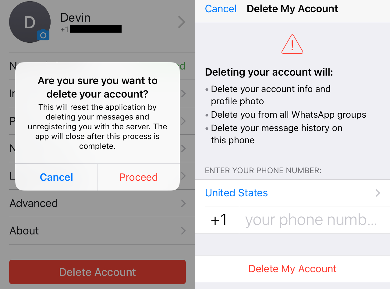 The next best-case scenario is that you have perhaps a few seconds or at most a minute to delete or otherwise protect your account. Signal is very good about this: The deletion option is front and center in the options screen, and you don’t have to input any data. WhatsApp and Telegram require you to put in your phone number, which is not ideal — fail to do this correctly and your data is retained.