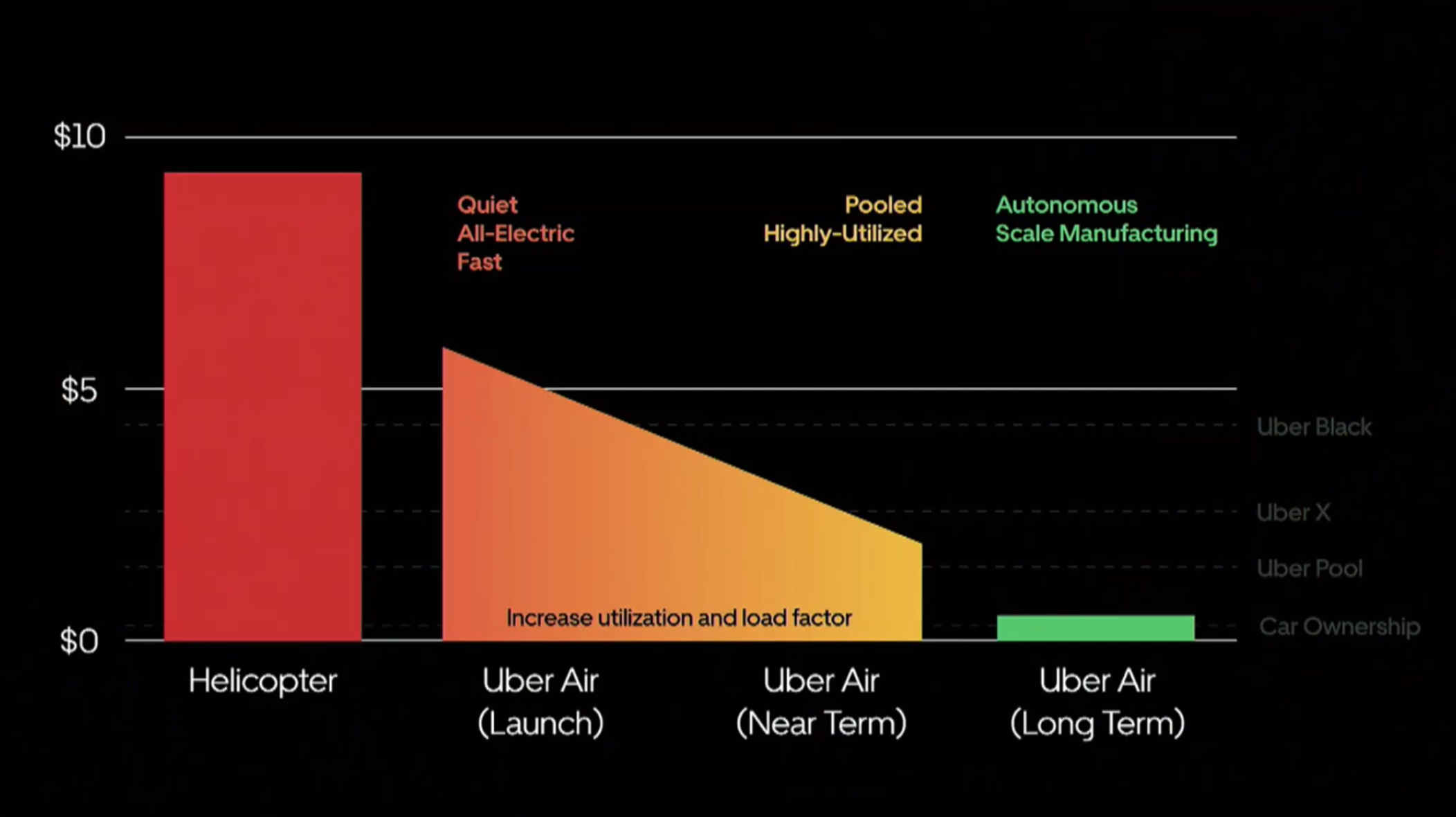 In the near term, Uber predicts Air will be comparable to the cost of Uber X and Uber Pool at around $2 per passenger mile. Long term, which is probably at least more than ten years from now, Uber Air will be more economical than owning a car, Uber Elevate Head Eric Allison said on the first day of the summit.
