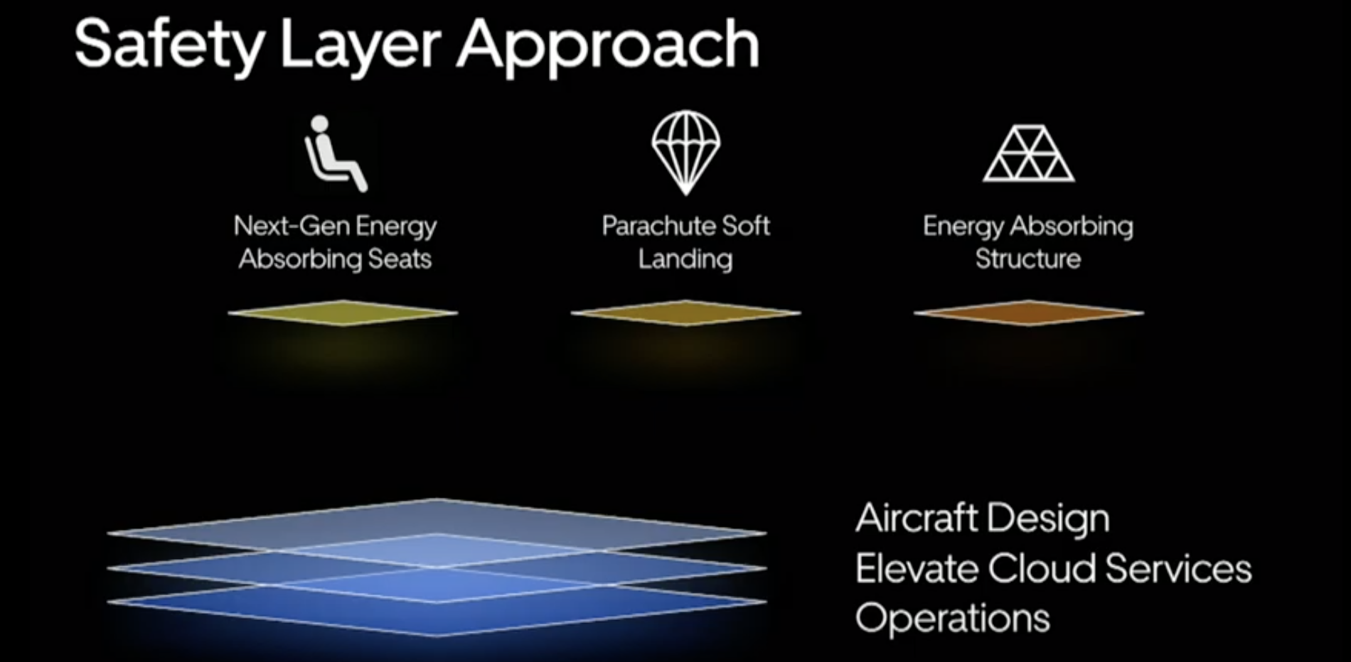 To prevent accidents, Kawecki says Uber is taking a multi-pronged approach. Called the “Safety Layer” approach, it provides “multiple, dissimilar methods for preventing accidents,” he said. On top of that, Uber sees value in harm barriers like energy absorbing seats, parachute soft landing systems and an energy absorbing structure.