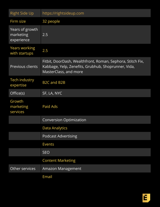 Right Side Up is not your typical growth marketing agency. As a former entrepreneur and in-house growth marketer for startups like Eventbrite, founder Tyler Elliston says he created RSU as a way to help his former self. RSU recruits a collective of expert growth marketers and partners them with various companies, but unlike a traditional agency, RSU actively encourages growth teams to hire their top talent.