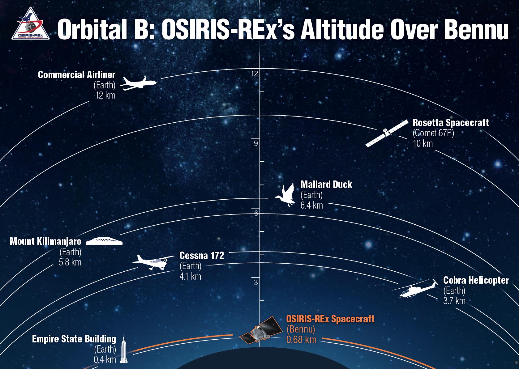 NASA’s probe is now just over 3,000 feet above the centre mass of Bennu, which is closer than your average military attack helicopters fly at cruising distance above Earth, as NASA helpfully points out in the illustrative graphic below.