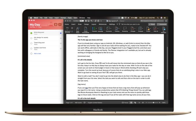 The company announced this morning its To-Do app is live on the Mac App Store, where it will support most of the core features right away, including the ability to create and manage tasks, work offline, share lists, utilize tags and more. It also will integrate with Microsoft Outlook to pull in your “Flagged” email list and will support integration with Planner soon, allowing you to see any items assigned to you.