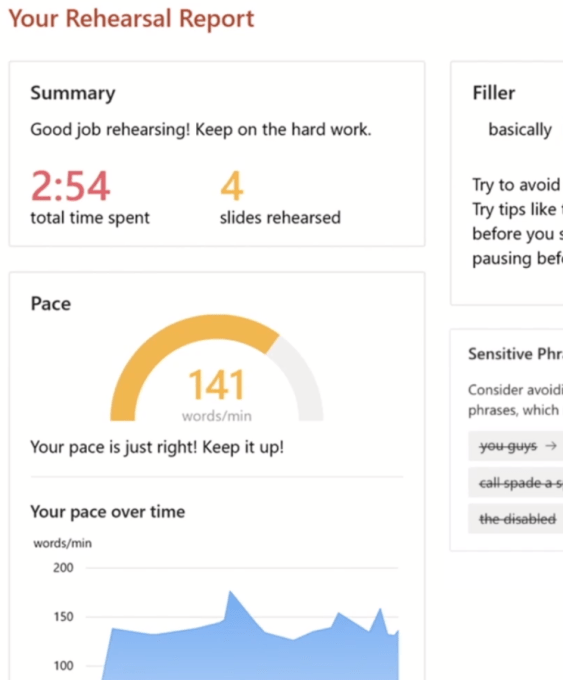 After your rehearsal session, PowerPoint will show you a dashboard with a summary of your performance and what to focus on to improve your skills.