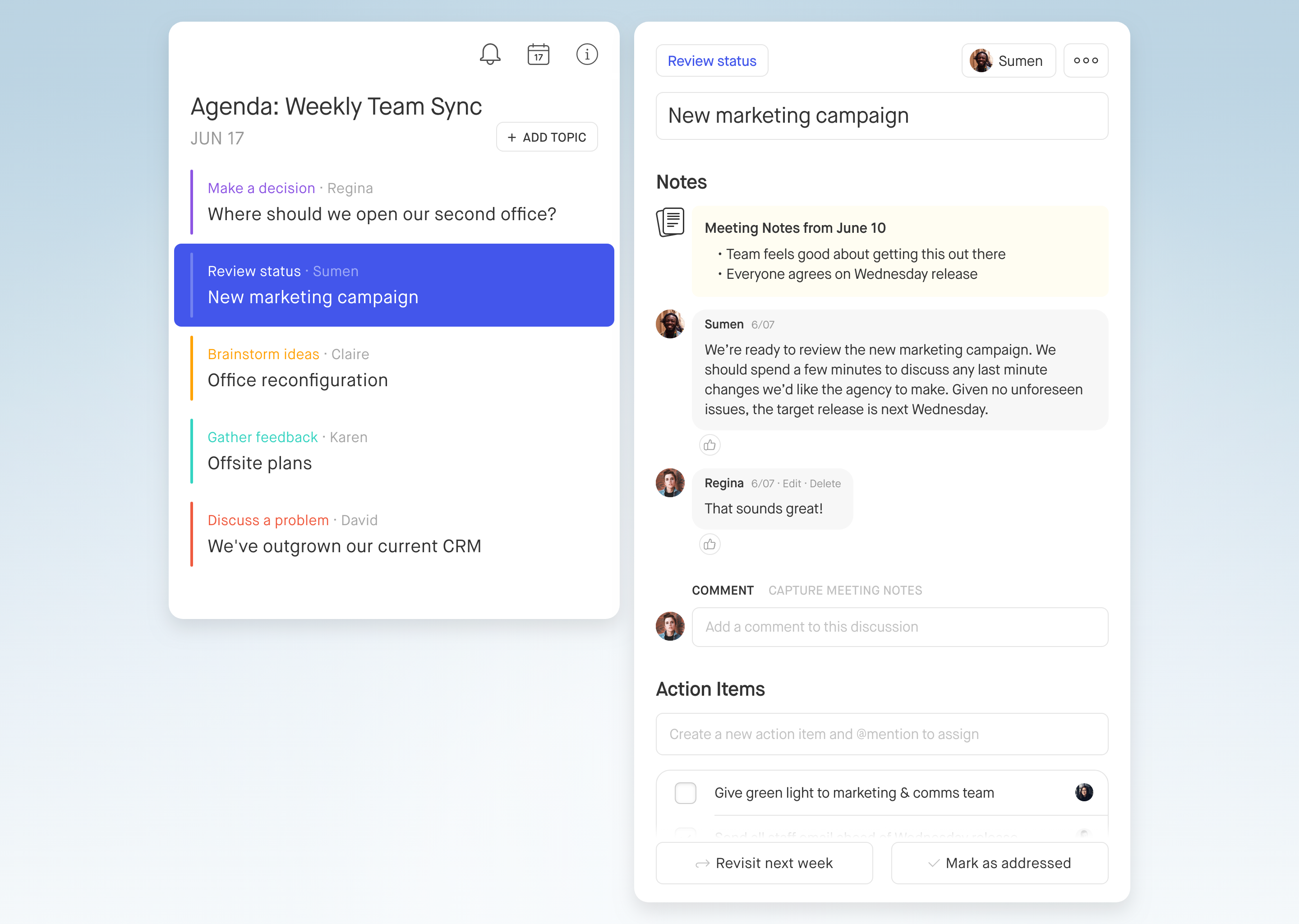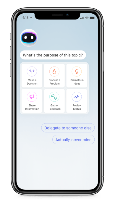First, it learns the topic of the meeting from participants and organizes them into a clear agenda complete with discussion topics. During the meeting, workers can use Navigator to quickly capture key takeaways that are later shared with every member of the meeting afterward. Later, the assistant checks in with attendees to learn whether they’ve completed their tasks.