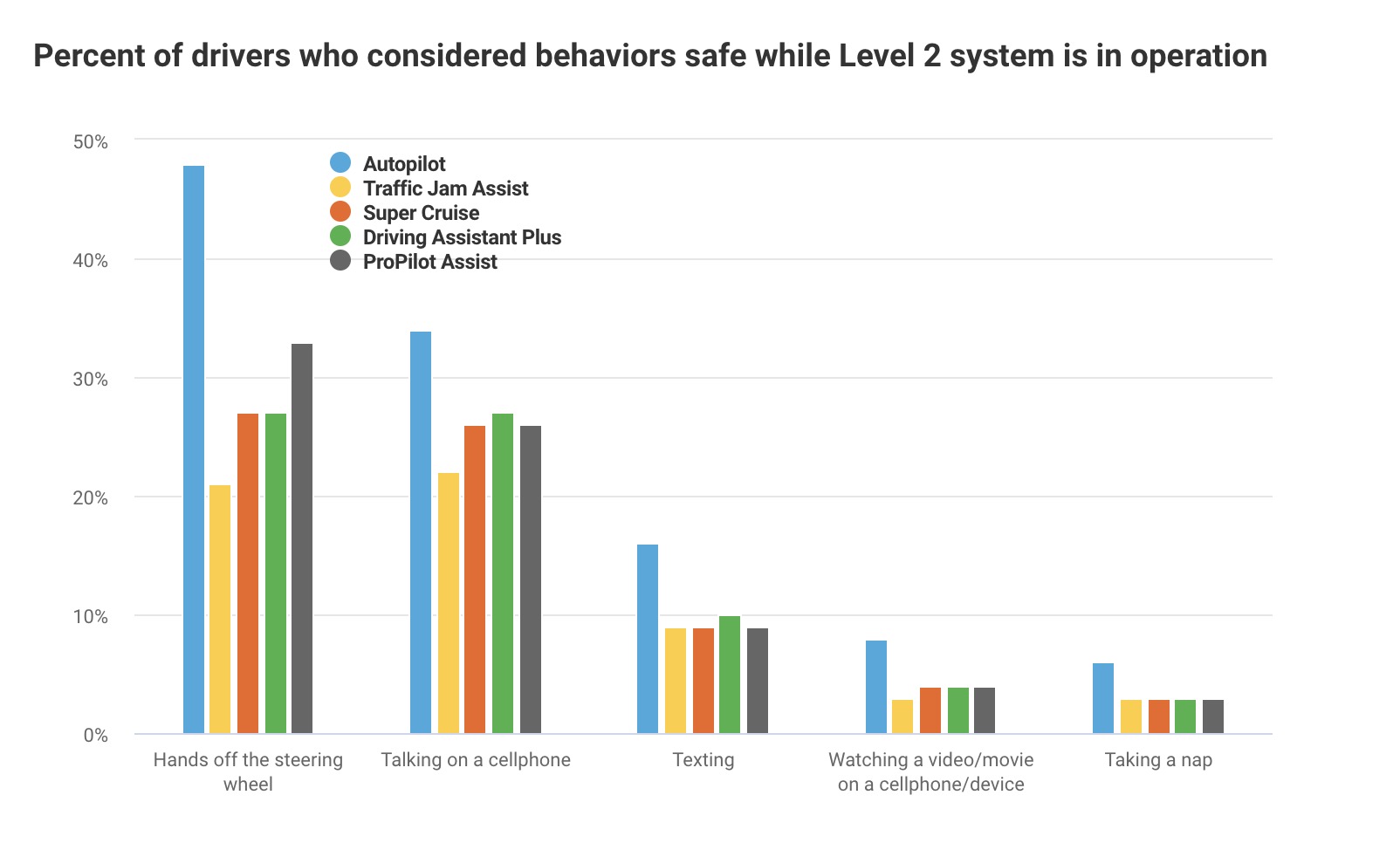 The perception survey asked 2,005 people about five “Level 2” driving automation systems that are available in vehicles today, including Tesla’s Autopilot, Traffic Jam Assist in Audi and Acura vehicles, Cadillac’s Super Cruise, BMW’s Driving Assistant Plus and Nissan’s ProPilot Assist. Level 2 means the system can perform two or more parts of the driving task under supervision of the driver. For instance, the system can keep the car centered in a lane and have adaptive cruise control engaged at the same time.