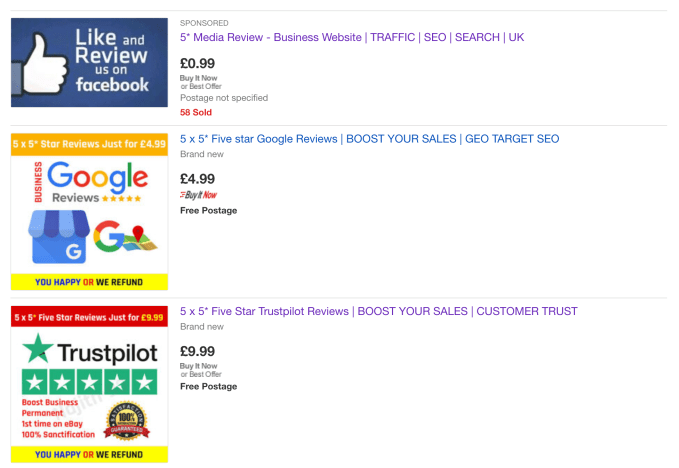 At the time of writing, a search of ebay.co.uk for “reviews” returned sellers offering five-star media reviews, five-star Google reviews and five-star Trustpilot reviews as the top three results — one of which was also a sponsored post: