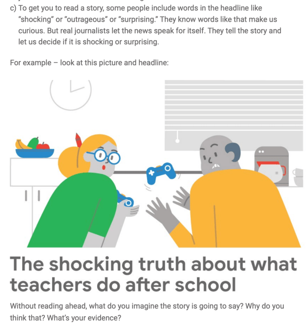 And the course delves into various tricks some websites use — like using photos that don’t relate to the story, using clickbait words like “shocking” or “outrageous” which they know make people curious,” using bold, underline, exclamation points or ALL CAPS, to convince you to agree with them.
