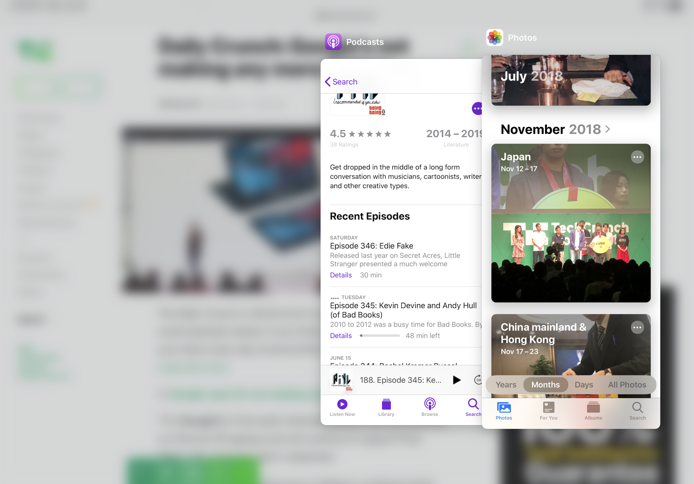 Multitasking, on the other hand, is the real centerpiece of the update. Slide Over, which offers a a second floating app window gets some key improvements, including the ability to have several different apps open in the mode at once by dragging them from the dock. Swiping up to the middle of the screen will display all of the apps open in slide over like a deck of cards. Swipe all the way up and the app will go full screen.
