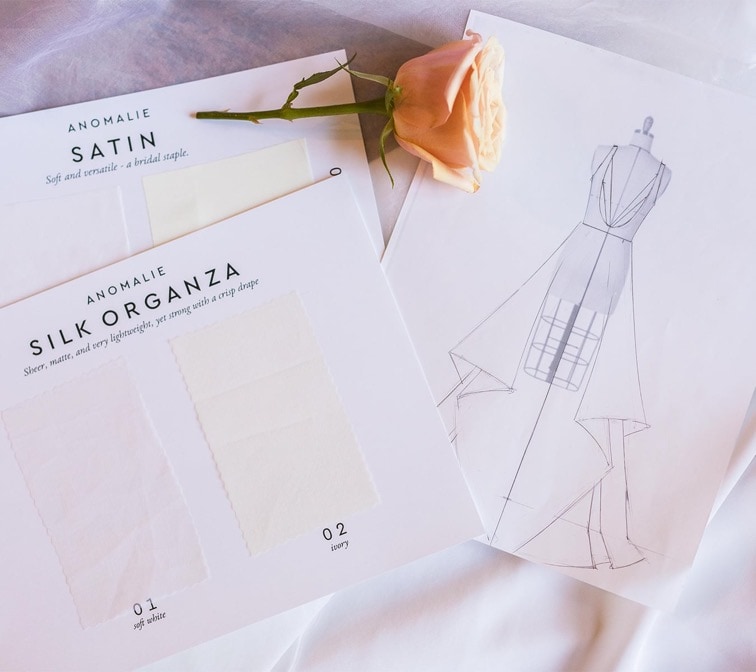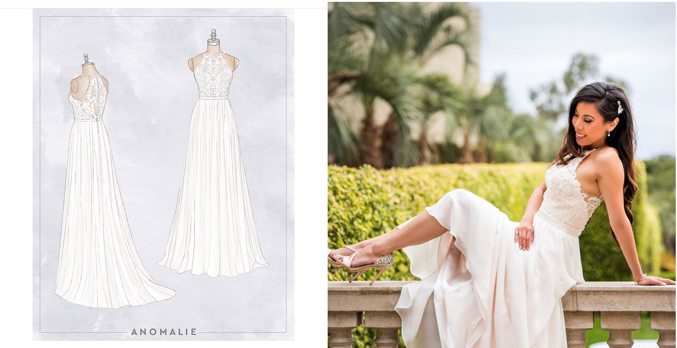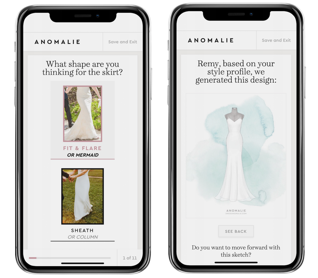 Anomalie is also flexing its tech muscle today with the launch of its new dress sketch visualizer. Choose between a few options on shape, cut, color, pattern, and fabric, and you’ll see an algorithmic sketch of your dream dress appear instantly. Anomalie then pairs you with a squad of its designers to finalize the details, ship swatches, and get you your gown with a 100% refund policy if it’s not right.