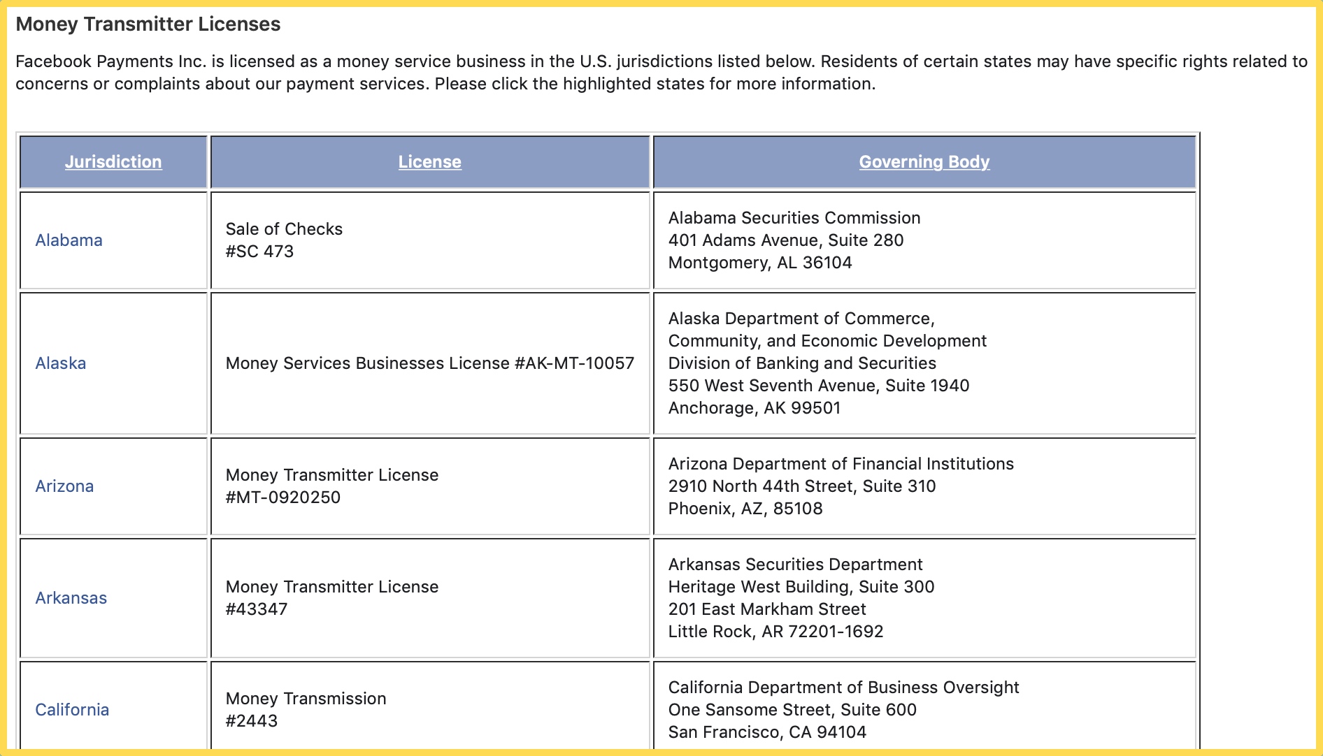 This isn’t the first time Facebook is creating a subsidiary to handle peer-to-peer payments. Facebook created a subsidiary called Facebook Payments Inc. It has money transmitter licenses in all 50 states.