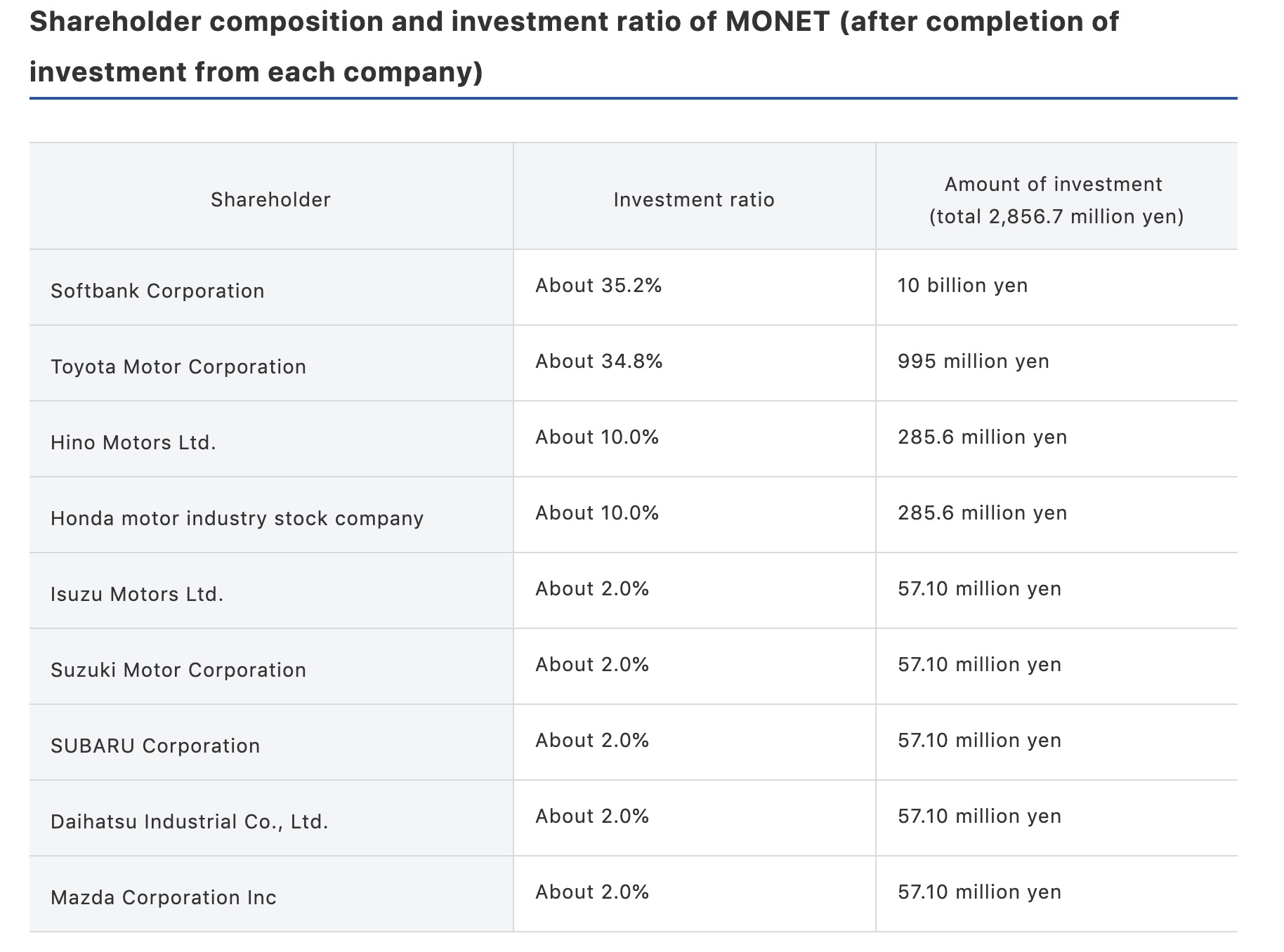 Five Japanese automakers including Isuzu Motors, Suzuki Motor Corp., Subaru, Daihatsu and Mazda will each invest 2% in the venture. Softbank and Toyota each own 35% of the company. Honda and Toyota’s truck-making unit Hino each have 10% ownership.