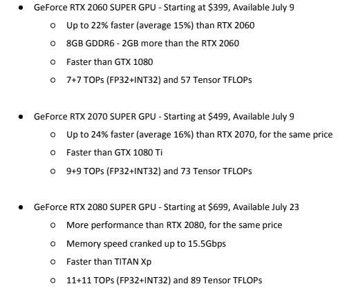 Prices for the GeForce RTX 2060 Super, GeForce RTX 2070 Super and GeForce RTX 2080 Super will start at $399, $499 and $399, respectively. Nvidia will continue to sell the entry-level non-Super RTX 2060 for $349, as well as the high-end RTX 2080 Ti, which starts at $999.