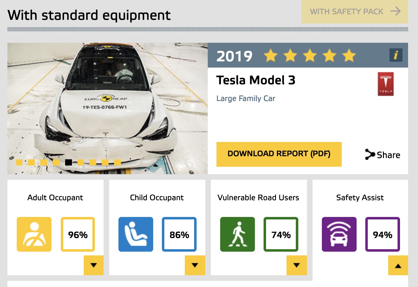 In a new round of testing, the European New Car Assessment Programme (Euro NCAP) awarded the Model 3 its highest rating of five stars. You can watch a video of Euro NCAP’s crash test below.