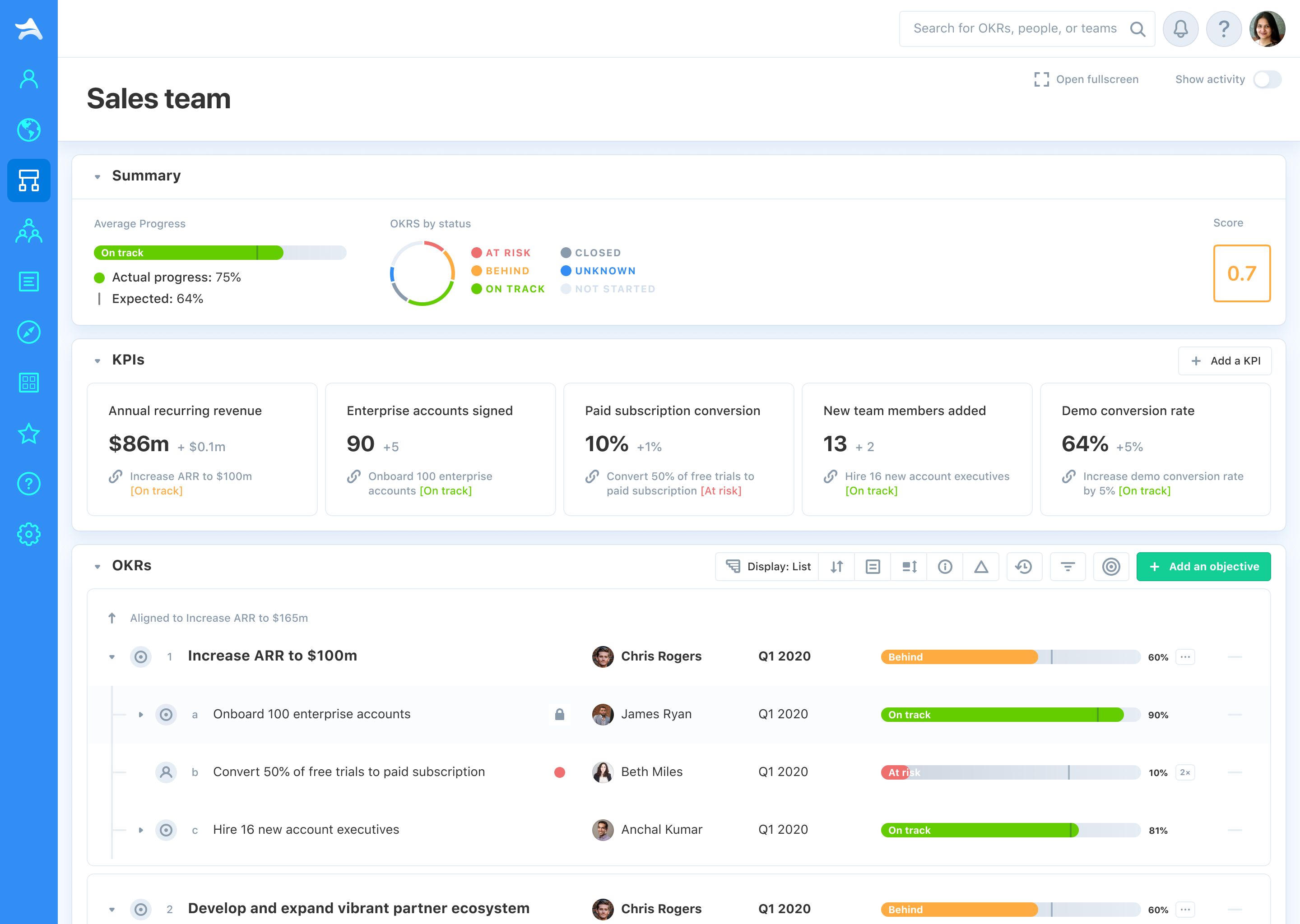 Ally founder and CEO Vetri Vellore tells me that he learned his management lessons and the value of OKR at his last startup, Chronus. After years of managing large teams at enterprises like Microsoft, he found himself challenged to manage a small team at a startup. “I went and looked for new models of running a business execution. And OKRs were one of those things I stumbled upon. And it worked phenomenally well for us,” Vellore said. That’s where the idea of Ally was born, which Vellore pursued after selling his last startup.