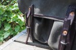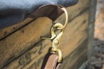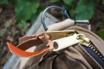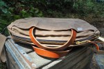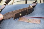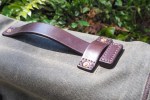 The leather straps and trim are a nice chocolate color and complement the blue well. It’s not heavy or stiff, and the shoulder strap in particular is very pliable — though so long I had to knot it to keep the extra out of the way (fortunately it looks cool that way). The snap closure can be a little tricky to get right by feel, but attaches solidly. The handle, which folds flat but pops up when you need it, is genius — probably the best handle of all the bags in this roundup, though not quite as robust as the Saddleback (but what is?).