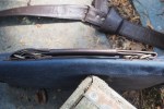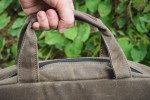 The olive-colored canvas is very thick and stiff, and waxed all the way through, not just in a layer on the outside. The stitching is industrial-grade and probably uses half a mile of thread. Quarter-inch-thick leather plates stiff as a board protect the back and bottom of the bag, and another serves to connect with the handle. The strap is a kind of folded-over canvas that feels even tougher than the leather. On top is a unique and practical thick leather handle that folds flat if necessary but feels very robust.