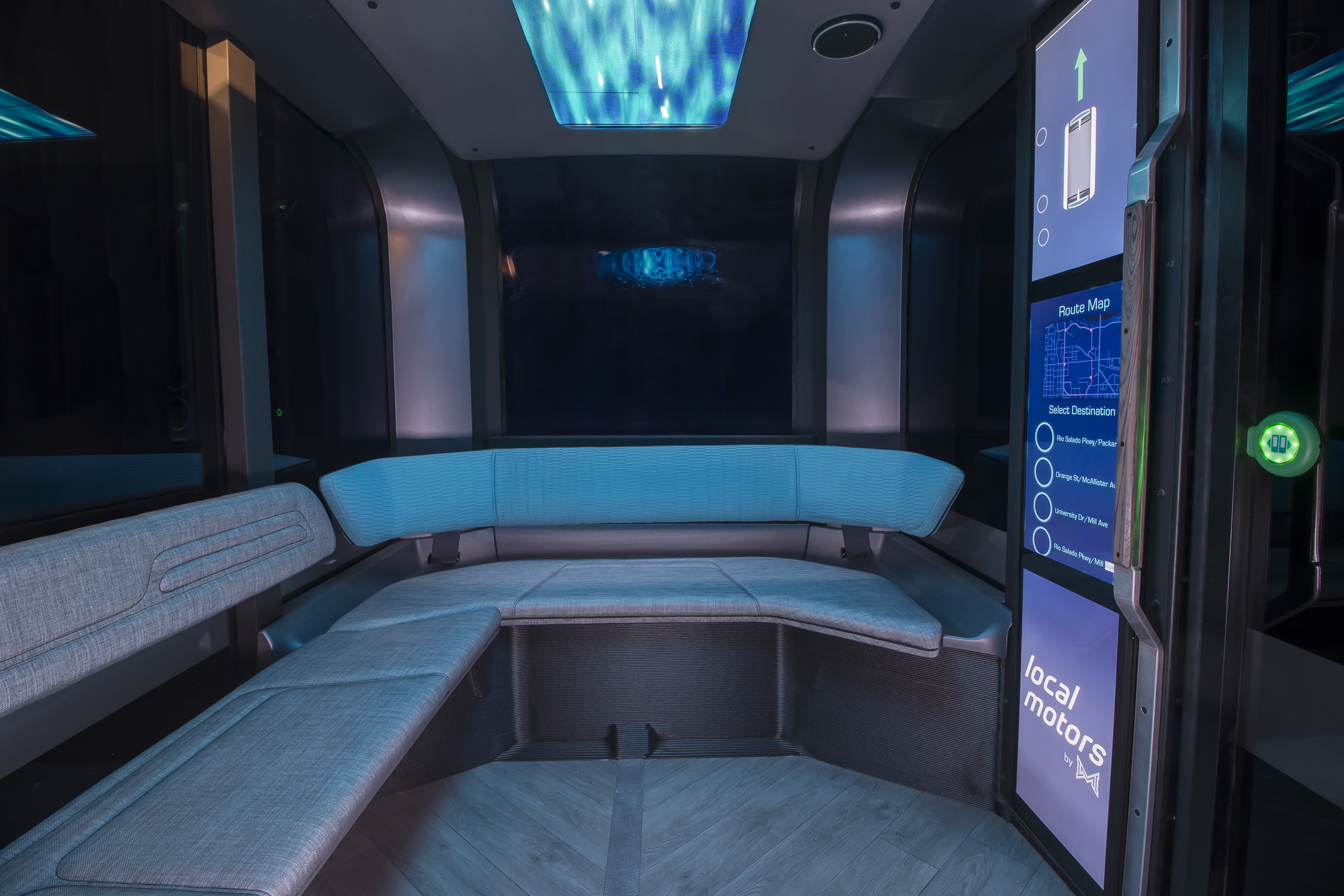 Inside the shuttle, riders will find better speakers and microphones and touchscreens. Local Motors has an open API, which allows for an endless number of UI interfaces. For instance, LG is customizing media content for Olli based on the “5G future,” according to Rogers, who said he couldn’t provide more details just yet.