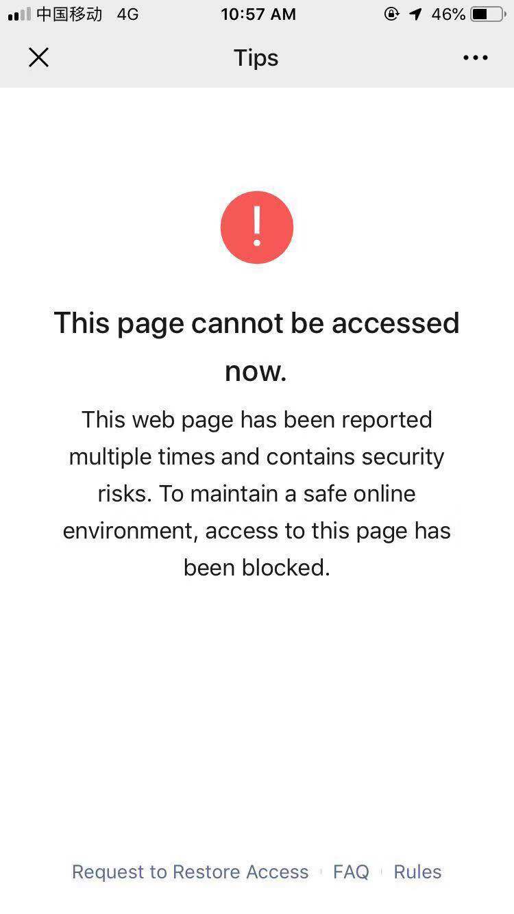 Users can still upload to WeChat videos they created with Zao, but if they try to download the app or send an invite link to another WeChat user, a message is displayed that says “this web page has been reported multiple times and contains security risks. To maintain a safe online environment, access to this page has been blocked.”